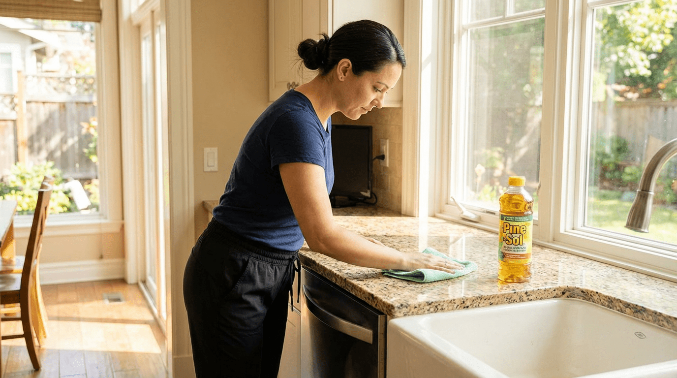 Pine-Sol can be very handy for everyday build-up on hard, sealed surfaces. In the bathroom, a diluted solution helps cut through soap scum on shower walls, tiles, and counters. In the kitchen, it can loosen light grease stains on backsplashes, cabinet doors, and range hoods. Always follow the label directions, and avoid unfinished wood or waxed surfaces.